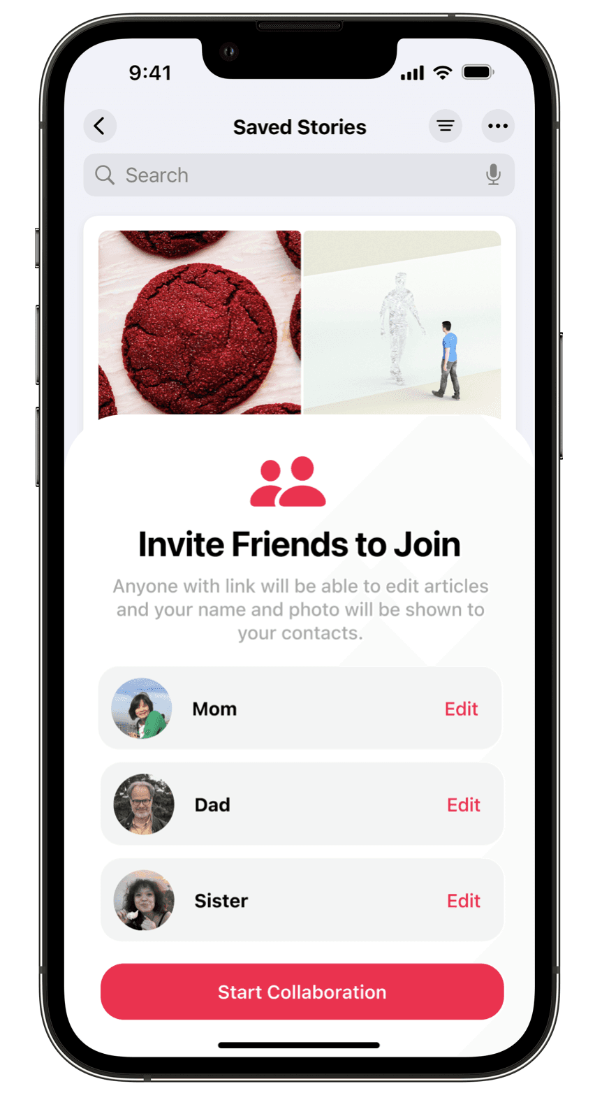Save articles in groups and collaborate on them with your friends and family.