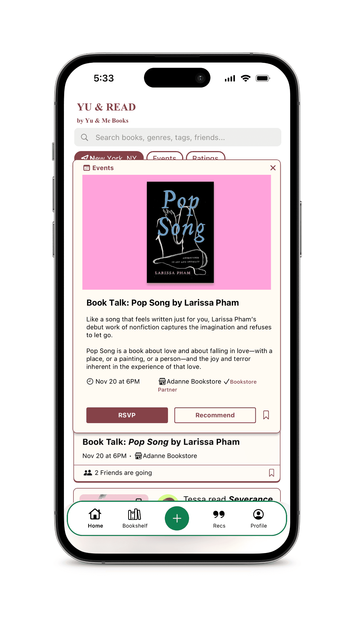 Making Yu & Read community and event focused was a big part of what makes it feel like a product of Yu & Me Books. I investigated their store and merchandise branding to make the app look the part too.